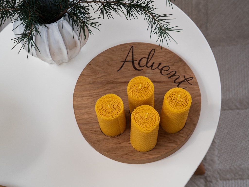 Dubový adventní svícen s autorským designem a nápisem Advent. Udržitelná alternativa klasického věnce – trvanlivý, originální a z dubového dřeva.
