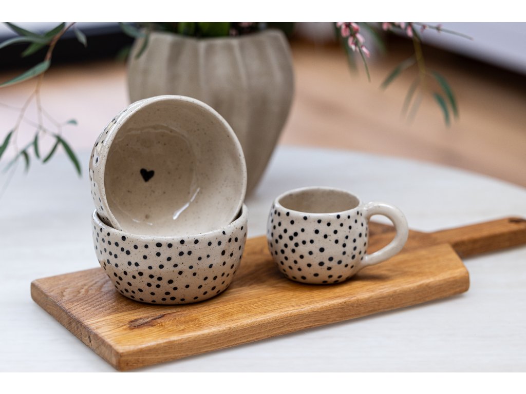 Jemný puntíkatý motiv dodává misce hravost a lehkost. Krásně se kombinuje s puntíkatými hrnečky ze stejné kolekce a vytvoří ti sladěný ranní set, který budeš chtít mít stále na stole.
