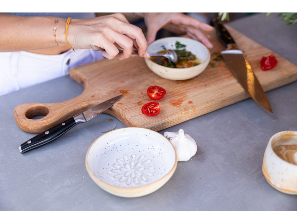 Objevte kouzlo české ruční keramiky v podobě unikátní misky, která spojuje krásu a praktičnost. Na jejím dně jsou ručně vyhloubené drážky ve tvaru kytičky – ideální pro strouhání česnek či rajčat. Stačí přidat bylinky, olivový olej, zakysanou smetanu nebo koření a během chvilky vytvoříte dip či zálivku, kterou můžete rovnou servírovat na stůl.