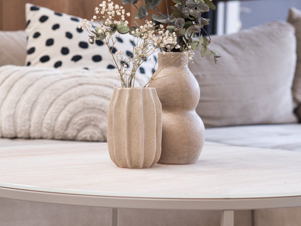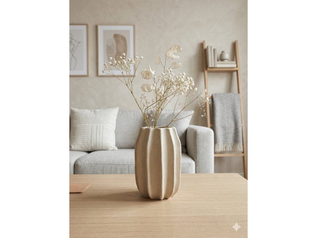 Díky své velikosti je ideální na drobné květiny, větvičky nebo sušené dekorace. Krásně vynikne samostatně, ale ještě víc, když ji zkombinujete s větší vázou Ema nebo třeba s miskou na nožkách ze stejné kolekce. Společně vytvoří nadčasový set, který můžete během roku obměňovat podle sezóny – a váš domov tak bude pokaždé působit jinak, a přitom stále harmonicky.