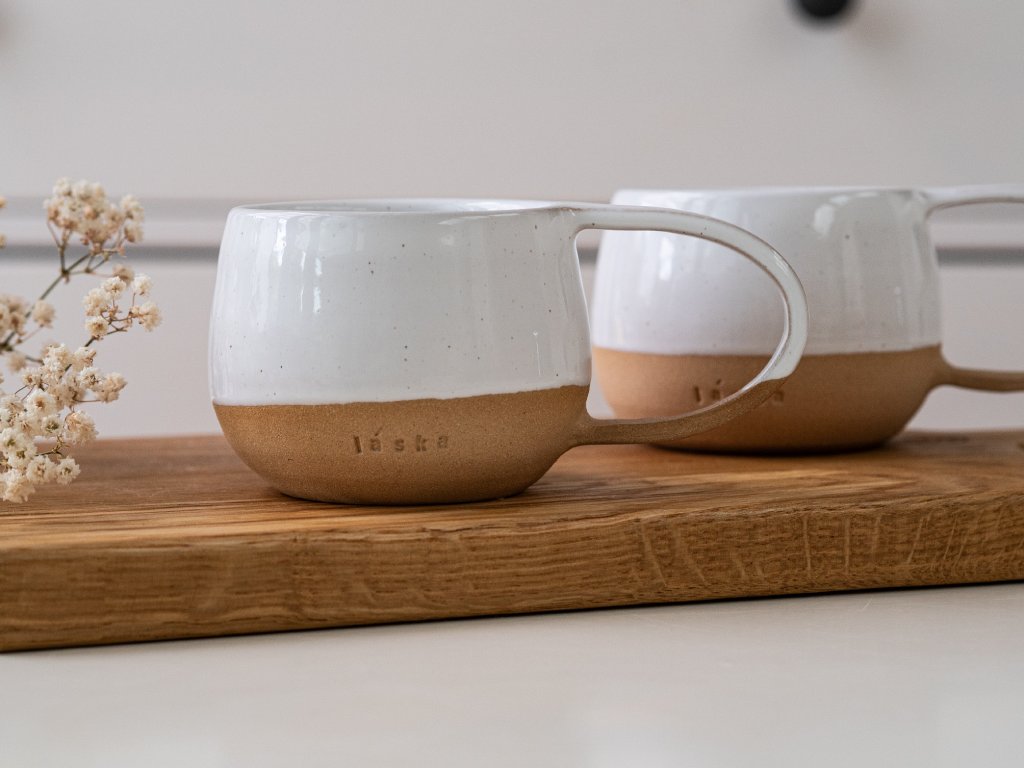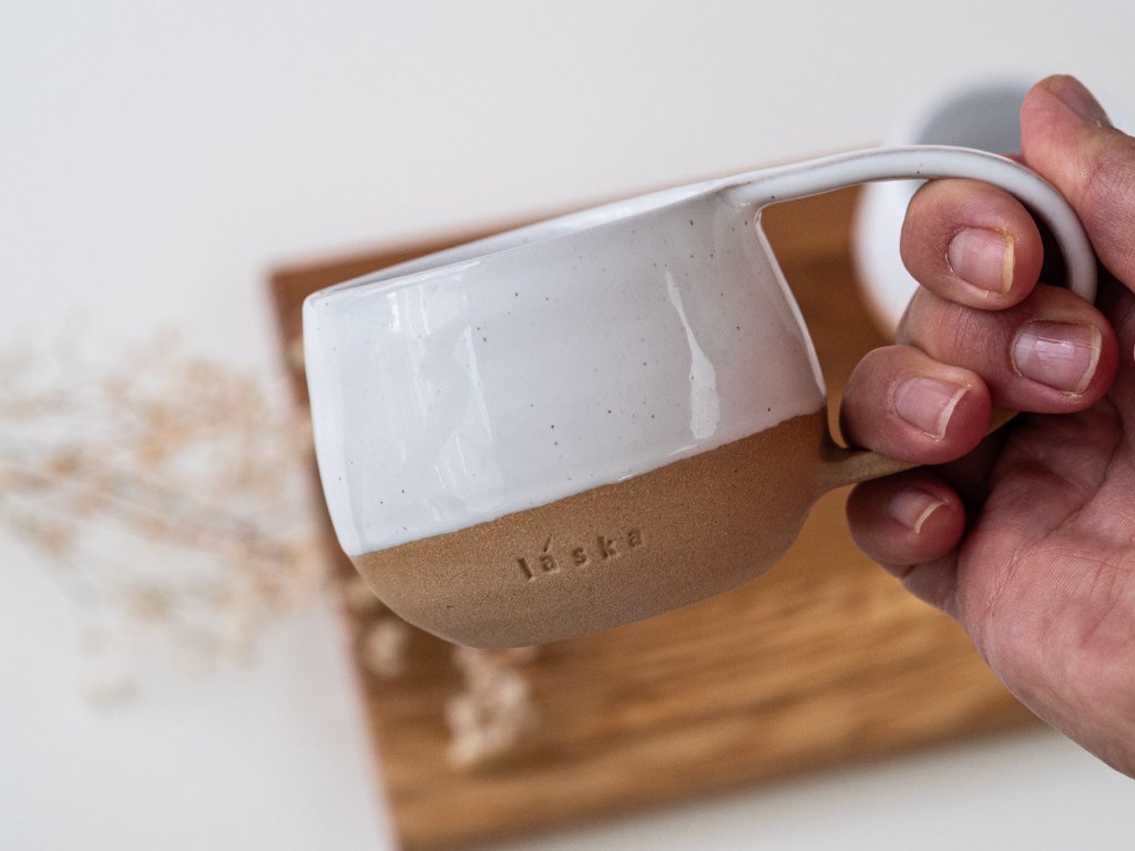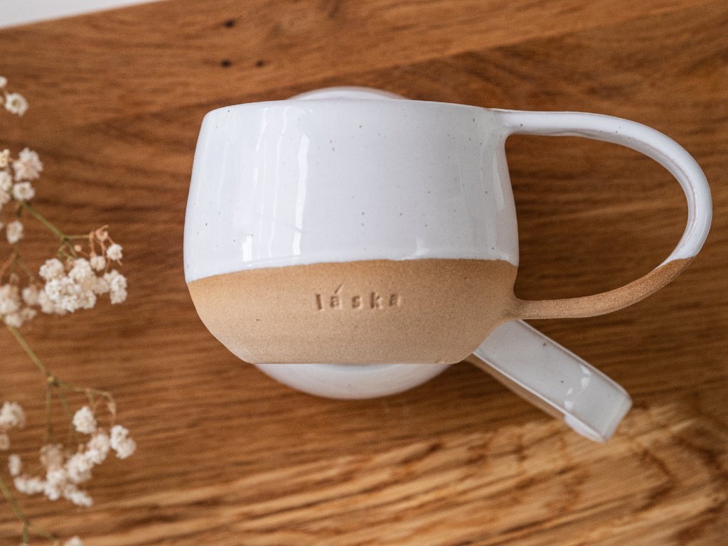 Ručně vyrobený keramický hrnek 175 ml s bílou glazurou a nápisem ‚Láska‘. Velké ouško pro pohodlné držení, ideální na cappuccino, kávu i ča