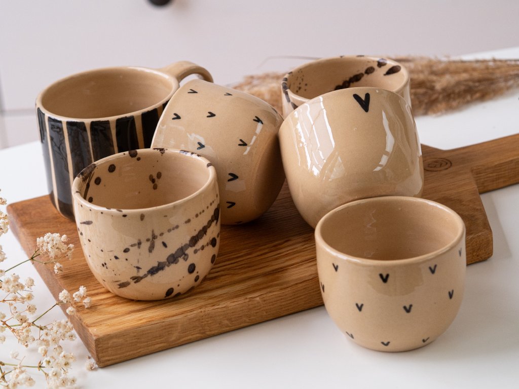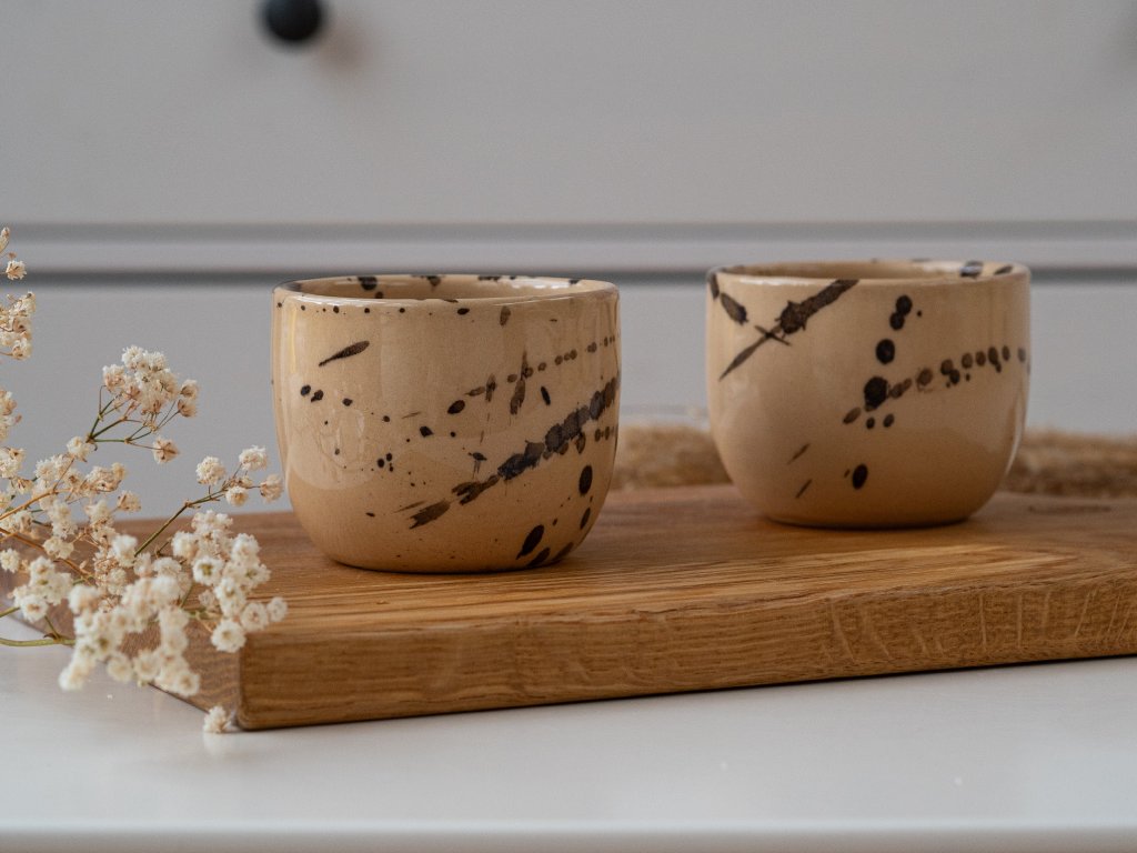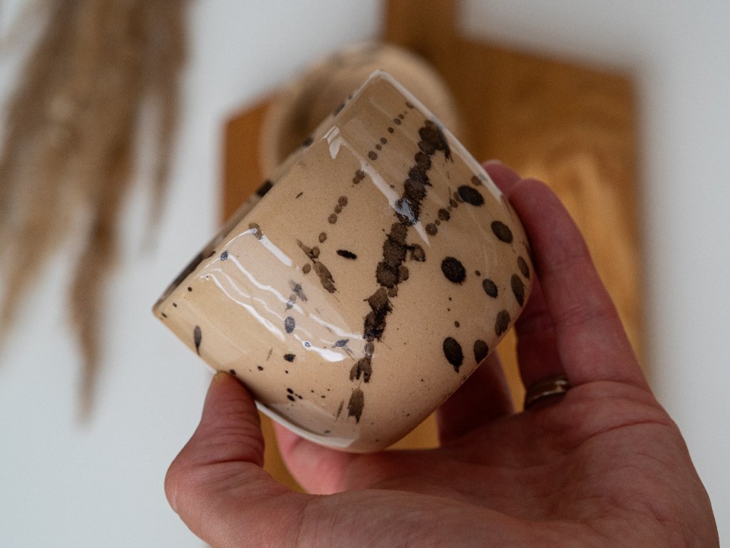 Ručně vyrobený keramický kalíšek s černými abstraktními kapkami 150 ml
