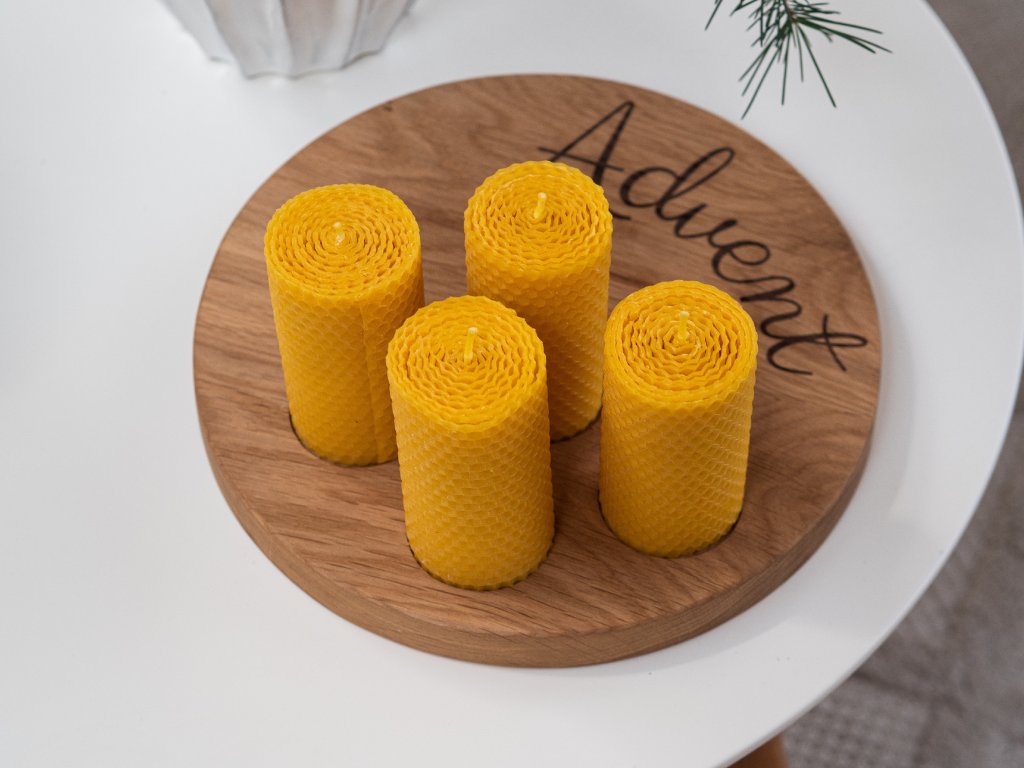 Včelí svíčky navíc působí na naše smysly uklidňujícím dojmem a vytváří doma opravdovou pohodu. Díky svému průměru jsou ideální do našeho dubového adventního svícnu s nápisem Advent, ale krásně vyniknou i samostatně – třeba na keramickém tácku nebo ve svícnu.