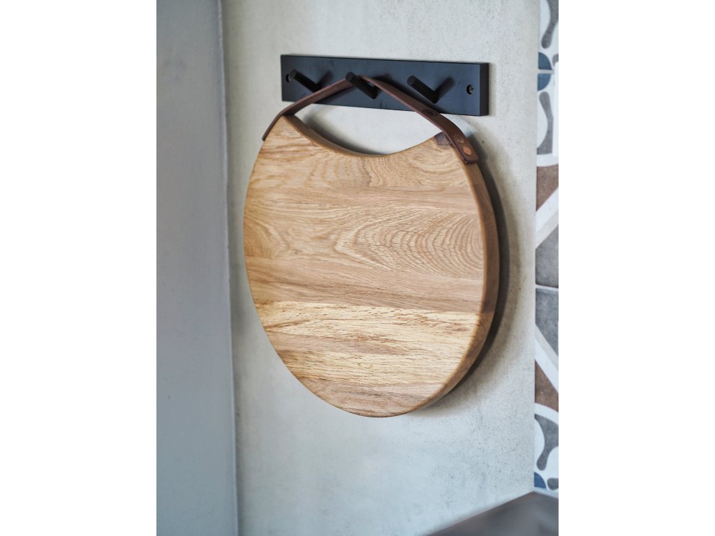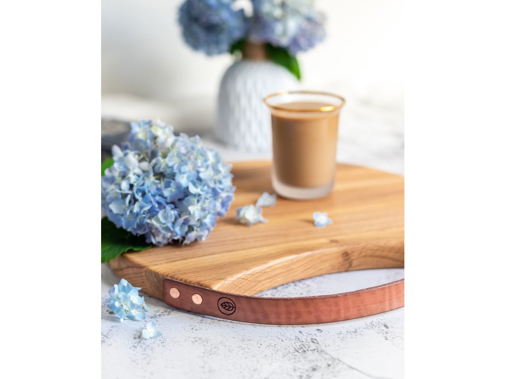 Stylové dubové prkénko s koženým poutkem. Ručně zpracované dřevo z Orlických hor, ideální na servírování i jako dekorace.