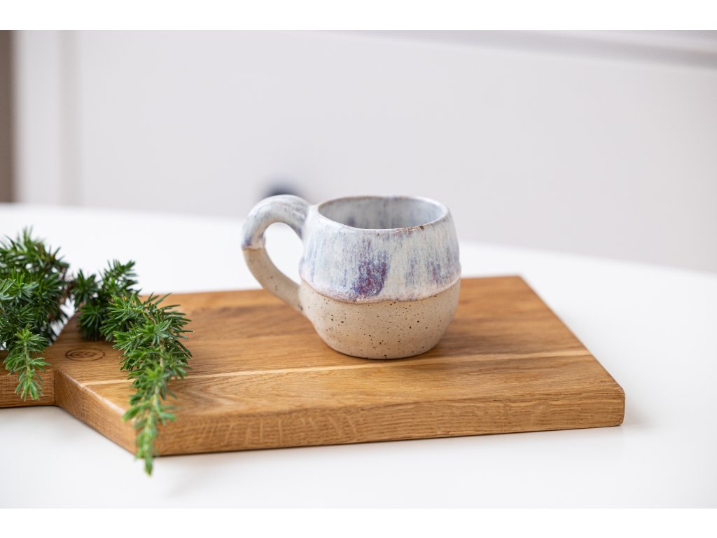 Světle krémová keramika působí čistě a elegantně, zatímco bílo-fialková glazura se po povrchu jemně rozlévá jako akvarel. Výsledkem je klidný, harmonický kousek, který v interiéru působí hřejivě a útulně.