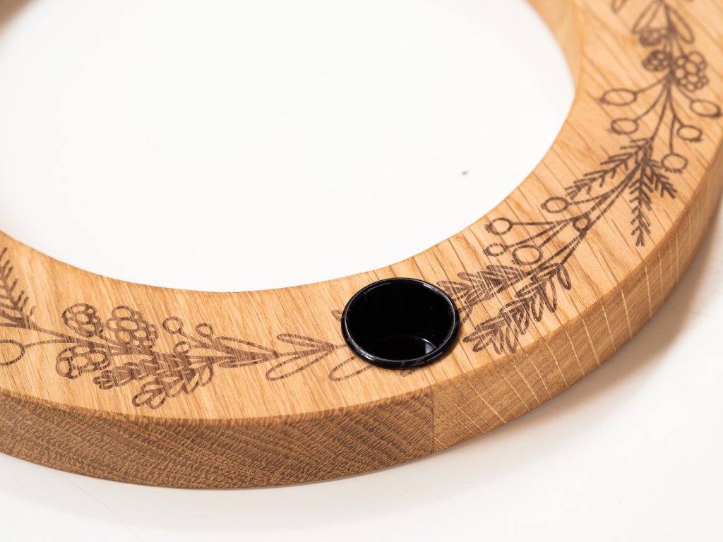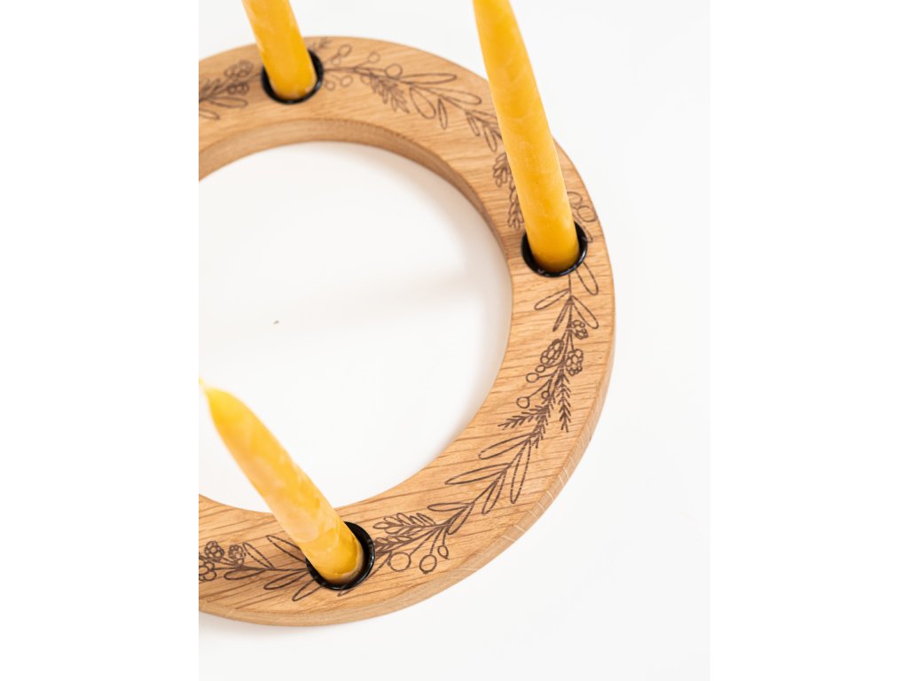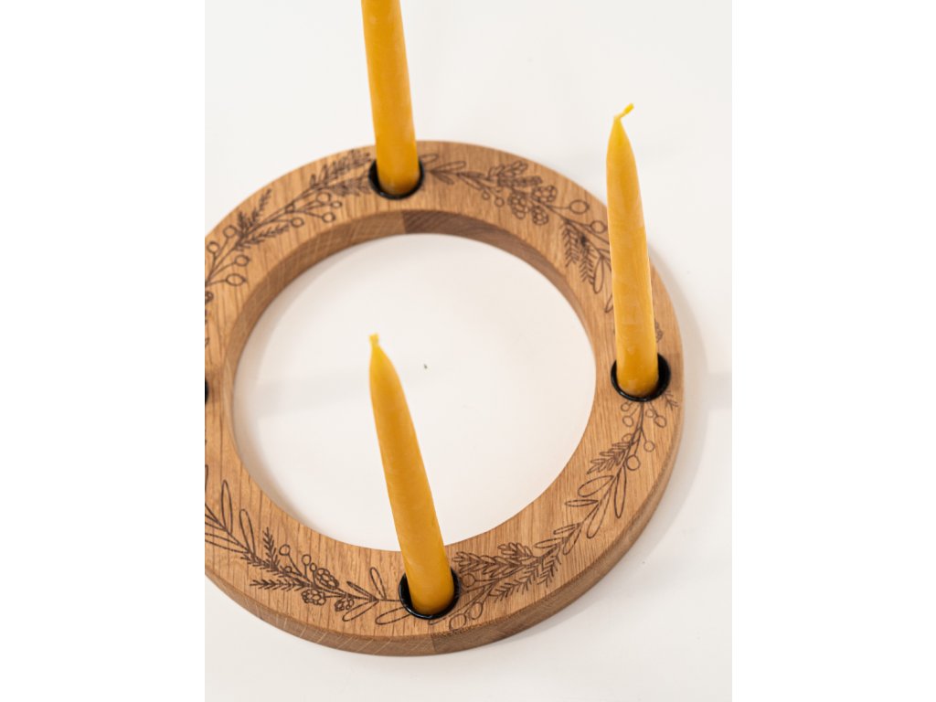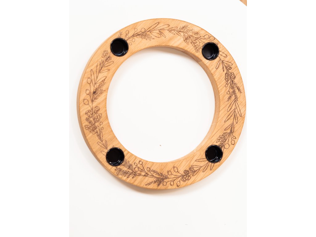 Dubový ručně vyrobený svícen ve tvaru kruhu s motivem zimní větvičky