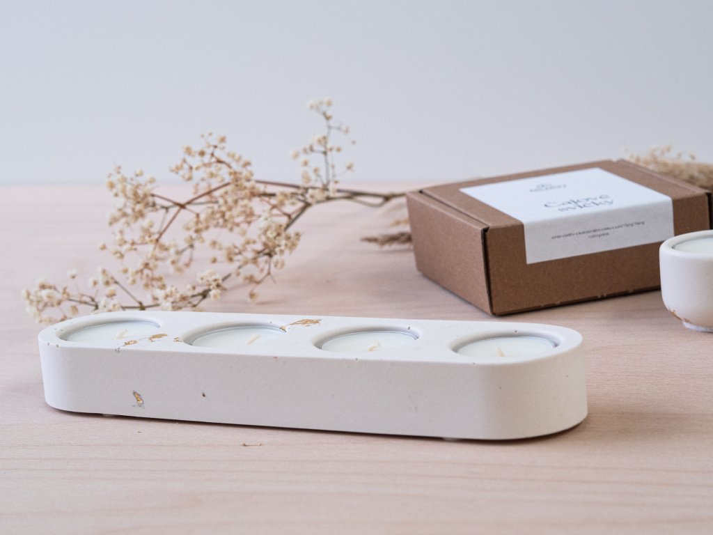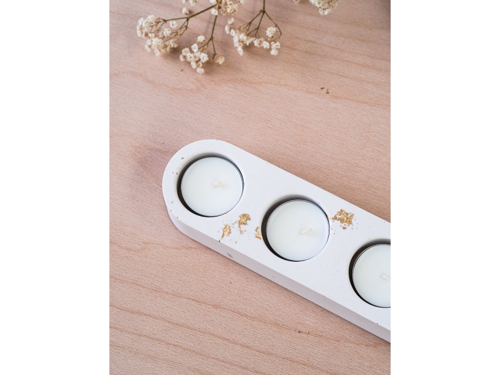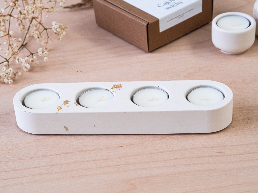 Velikost 24 × 6 cm umožňuje pohodlné umístění na stůl, poličku nebo okenní parapet. Díky otvorům na standardní čajové svíčky můžete snadno vytvořit sváteční i každodenní atmosféru. Pro dokonalou kombinaci můžete svícen spojit se setem dvou menších svícnů a vytvořit elegantní aranžmá. Čajové svíčky z přírodního vosku můžete objednat zde.